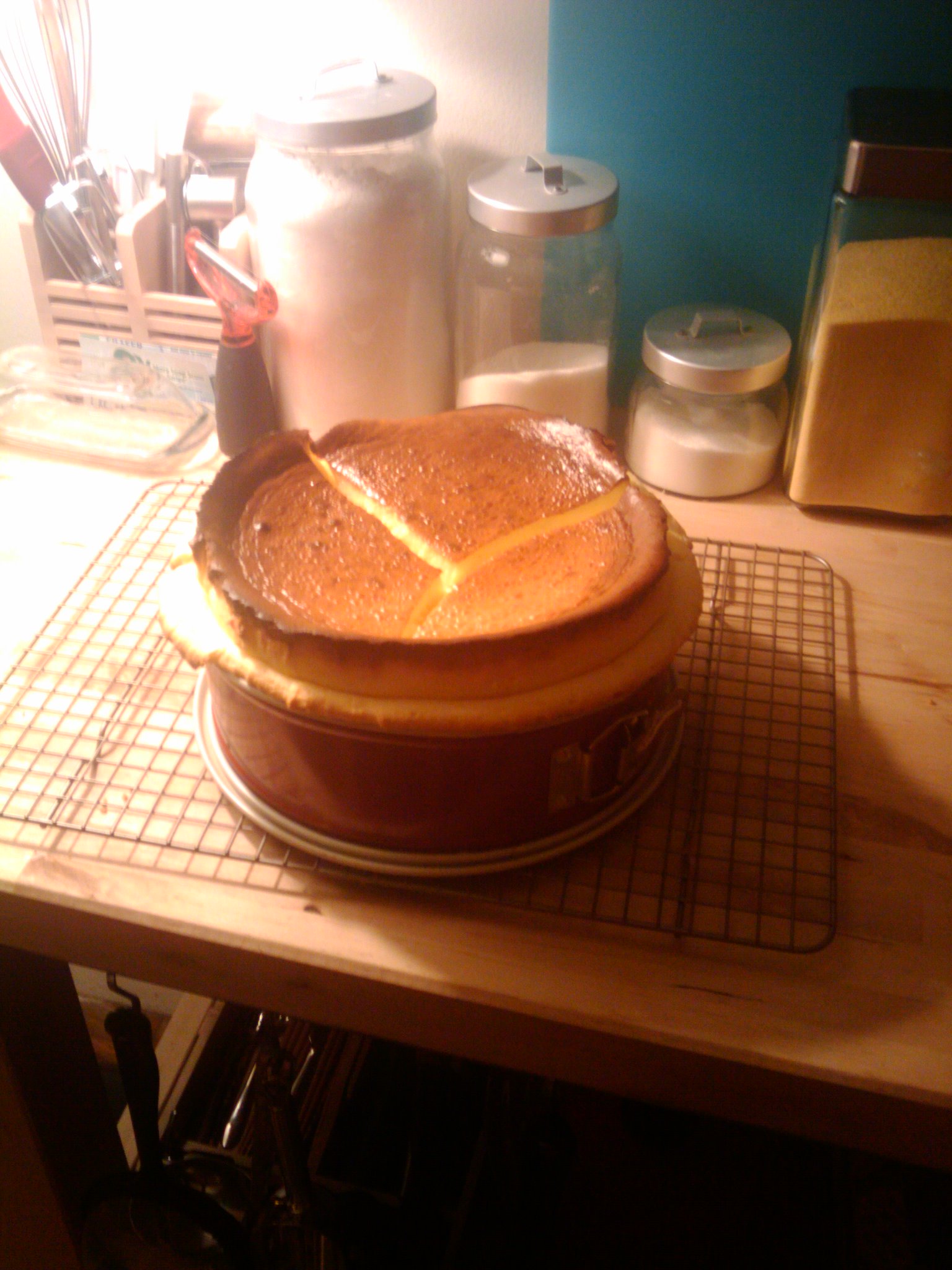 Left with only a half a hand mixer things still seemed fine. Slowly but surely, the dying mixer softened the cream cheese and united it with the rest of the ingredients (eggs, vanilla, etc.). It actually reminded me a little of some of my favorite force improvisational cooking while cooking with friends back in Minnesota. Everything got mixed and poured on top of the gram cracker crust in the spring pan and put in the oven.