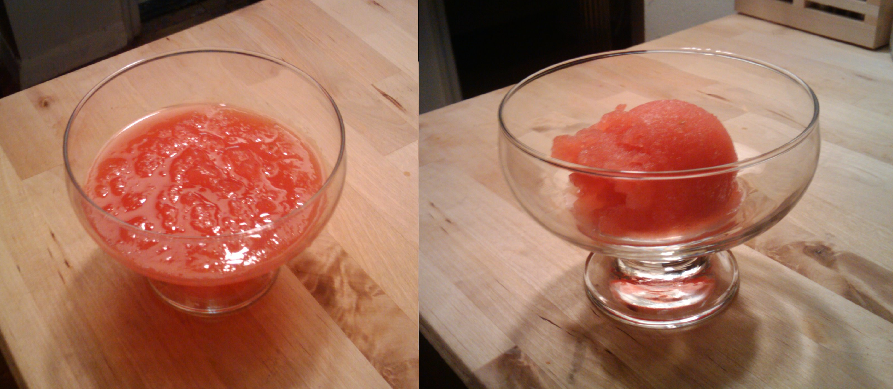 I ended up making both the ice cream maker version and the slush because I didn’t know, looking at watermelons in the store, how many cups of “chunks†they would give me. It turns out about half-a-pound of watermelon is a cup, as I learned when I bought about 5 pounds, twice the 5 cups I need for my planned sorbet.