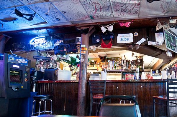 simple cement floor. Still, even though it was early, about 7 in the evening, you can tell the place can get rock’n. There are bras literally hanging from the ceiling which has writing from past visitors all over it.