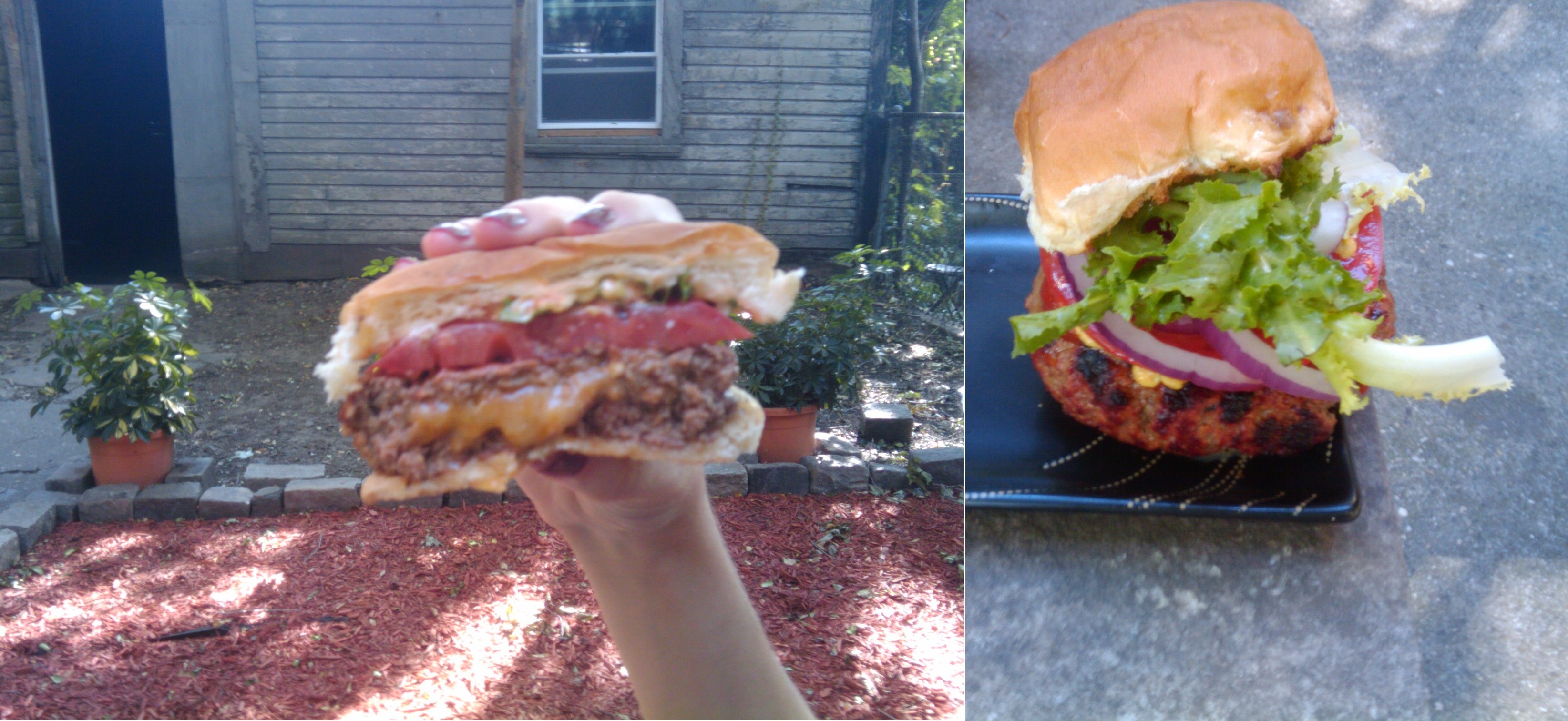 On our second grilling day, Labor Day proper, Meg was hit with a brilliant idea: cheese inside the burgers! Having experimented with putting various herbs and spices in the burgers we decided to mix some Chipotle Tabasco sauce in with the meat. To get the cheese inside, I basically made a smaller-and flatter-than-normal burger with a dent in the middle which I filled with cheese, and then I put a similarly-sized beef patty on top. Softly pinching and massaging sides of the burger makes the patty whole, with the delicious cheese trapped inside.