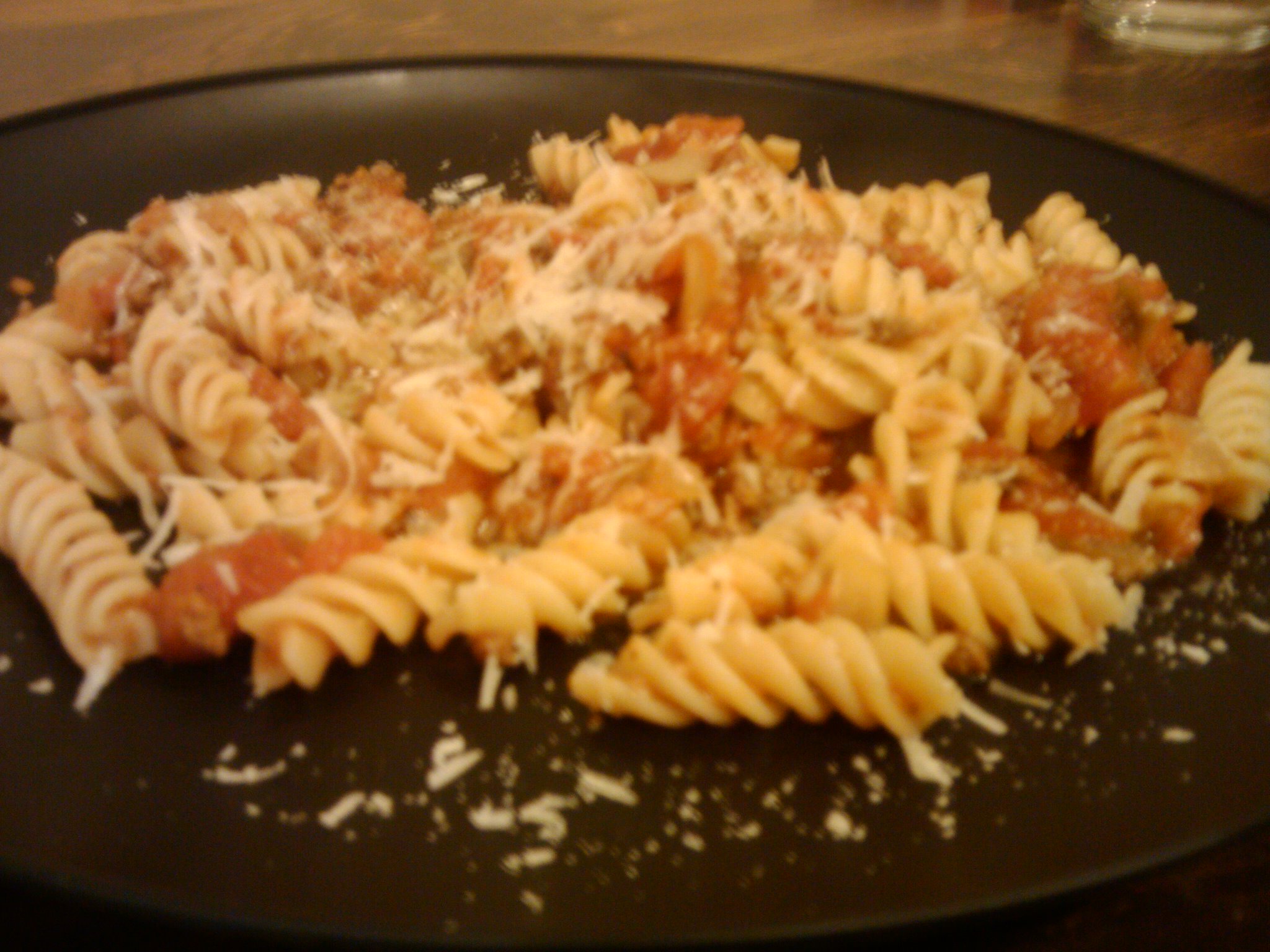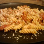 Last night’s dinner was still a meal of simple pasta, but the added 5 minutes of turning the veggies, meat, and tomatoes into a sauce while the pasta water boiled was pleasant change from the jar-o-tomato sauce.