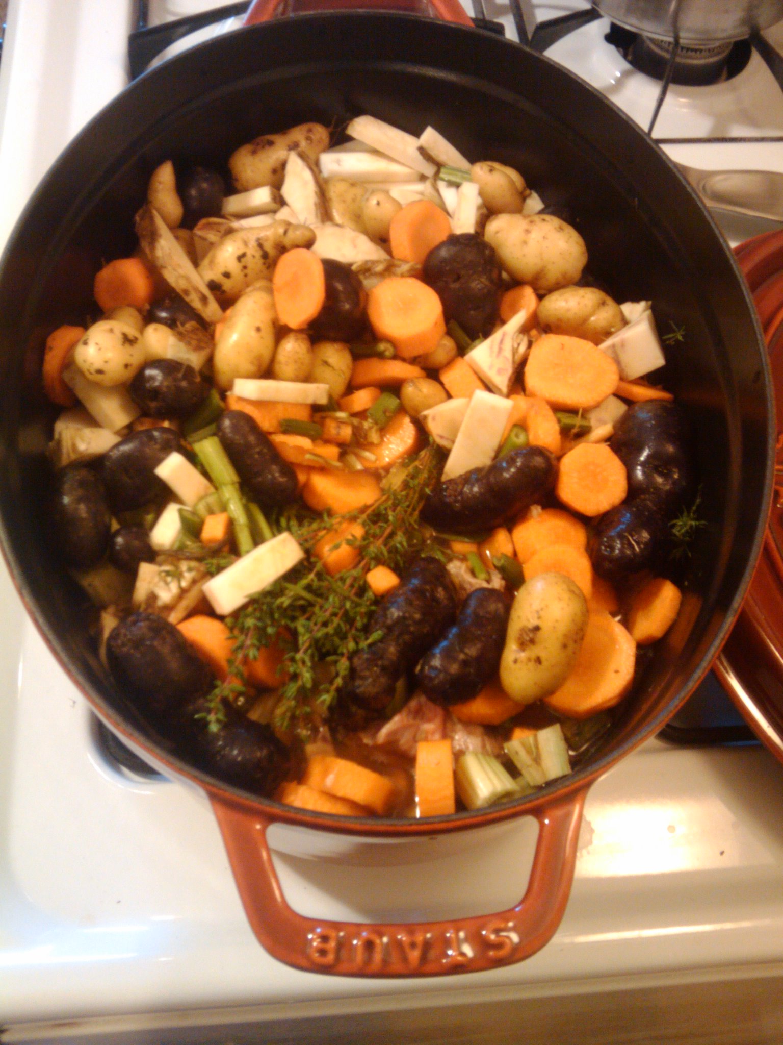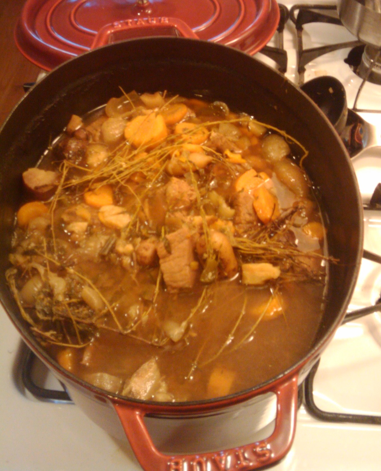 When the stew was done, I fished out the stems of the herbs (where I more fancy I would have used an herb bag—someday).