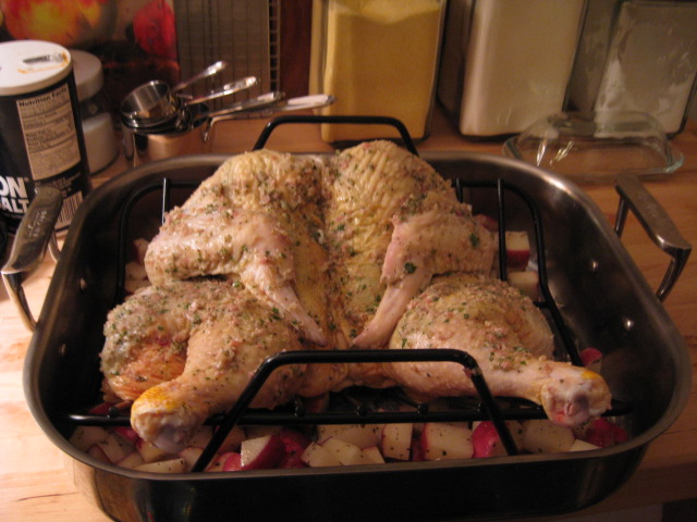 Heat the oven to 450. Choose a roasting pan that will hold the potatoes tightly together. The idea is to keep them from burning here. Remove excess fat from the chicken and place chunks among potatoes.