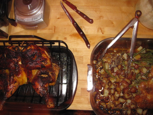 Check to see that the chicken is fully cooked by slicing the thickest part of the thigh or breast with a knife and making sure the juices are running clear. Then lift the chicken on its rack off of the pan, and let it “sit” for another 20 minutes or so while you jack the oven up to 50o degrees and finish giving those potatoes a nice crisp finish. (This dish tastes great with green beans, too. Just add them to the bottom of the pan with the potatoes for the last 40 minutes to an hour of cooking time).