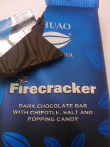 This guy clocks in with 60% cacao (the stuff that gives dark chocolate its great bitter flavor) Â I recommend holding a small piece in your mouth an letting it melt. Â At first the flavor is mild. Â But as the melting starts you get a wave of cacao, then you feel a warmth and get a little smoke from the chipotle, all the while the salt lends a savory depth. Â Â AND THEN THE FUN STARTS. Â Suddenly you feel the little prickles on your tongue and soon the feeling fills your mouth and the popping sound fills you head. Â I was a little kid, visiting my grandparents, and eating poprocks for the first time.