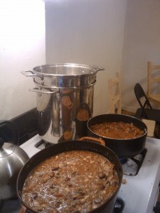 Since the size of this batch was crazy, I’m just going to talk about the ingredients at a high level. You first start with onion and celery at a 4:1 ratio.  Be generous with this mix, it adds great flavor, but cooks down a lot so start with maybe 1/8 pot worth.  Pour a little olive oil into a pot and cook (stiring regularly) the onions and celery until the onions are translucent and just starting to brown.  Then add some ground meat.  You can really use whatever suits you (beef, turkey, pork, etc.).  I usually just get what’s on sale.  Today I got a big pack of beef and normal pack of pork, again at a about a 4:1 ratio.  As the meat finishes browning, throw in chopped fresh garlic to taste.  Then you need to add tomatoes, you can just use canned stuff–some tomato sauce, some stewed tomatoes, some diced.  Again, whatever is on sale works, but a mix is a good bet.  Next are beans.  Red kidney beans are a must.  You can just stick with these or expand a little into white kidney beans (which add a bit of color) or other similar beans.  For spices, go with some chili power and red pepper flakes.  If you want to experiment with spices, just add them in small amounts.  Chili is a perfect taste and modify as you go dish.