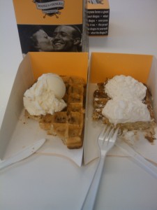 On the walk over to the cart, I got a rundown on the menu.  The bacon waffle is a relatively new addition and has bacon actually integrated into it.  The deluxe waffle is called Da Throwdown and it packs spekuloos (a paste that is some kind of cross between a cookie and caramel) and whipped cream.  It was added to the menu after the Wafels & Dinges beat celebrity chef, and asshole,  Bobby Flay on his show, the Throwdown.  You can choose to top your waffle with ice cream and/or scale everything back to an afternoon snack sized mini-waffle.  The ice cream flavors rotate, and on this trip there was beer & honey (yeah, that’s right, beer ice cream!) and some kind of strawberry swirl  something that I stopped remembering after I heard about beer ice cream.