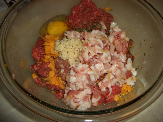 Today’s recipe was inspired by two things. First, my new place has a grill, something I’ve been missing for the last year. Second, we were in the middle of a horrid heat wave at the time. With temperatures hovering around 95-100 with outrageous humidity, we were doing our very best to not do any cooking inside. Thus were born the cheddar-bacon cheeseburgers.  And because that sounds a bit too simple, we’re gonna go for internal cheddar and bacon. You’ll need: