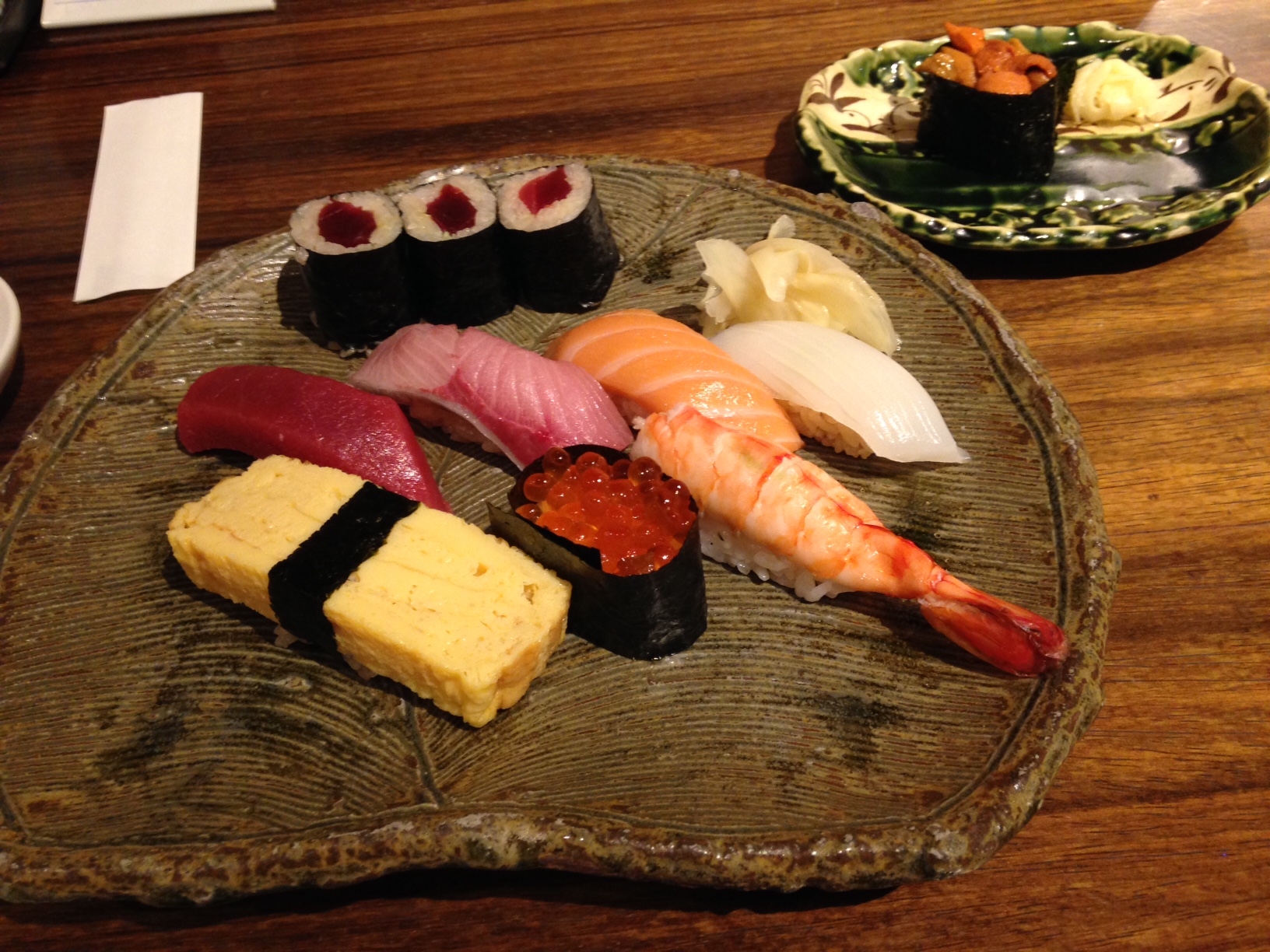 The meal is amazing. Hands down without a doubt the best tuna roll I’ve ever eaten. Flavor (tuna, small bit of wasabi, a little hit of rice wine) is all there. And the texture is perfect. The salmon nigiri is among the best I’ve had. The high quality cut of fish nearly melts in my mouth. The sea urchin is more of a choped solid than the goo I’m use to–a wholly different texture– and of course the flavor hits the mark. The other fish, the roe, and the egg don’t disappoint. At this point I’m full. I don’t need another bite. But I scan the menu for something else to try. Tragically, they are out of octopus so I adventure and order the sardine which is also incredible. The sardine tastes like nothing out of a can has a perfectly prepared amount of wasabi and soy sauce on the nigiri.