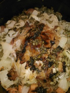 With the lid on, and the oven at 375, I just let everything cook for maybe a bit more than 90 minutes–after about 30 the smells of onions, chicken, and bacon were wafting through the apartment.  I took the lid of for the last 15 or so minutes, as I made some quinoa, just to help the onions brown a bit; because of the sugars in the jelly, the chicken was already there.