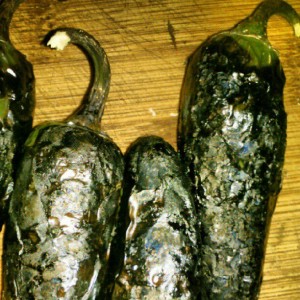 Before doing anything else, I fire roasted the jalapeños by sticking each with a kebab skewer and roasting slowly over the stove’s gas burner until blackened. It may be my imagination, but I fee this process adds just a bit of smoky flavor.