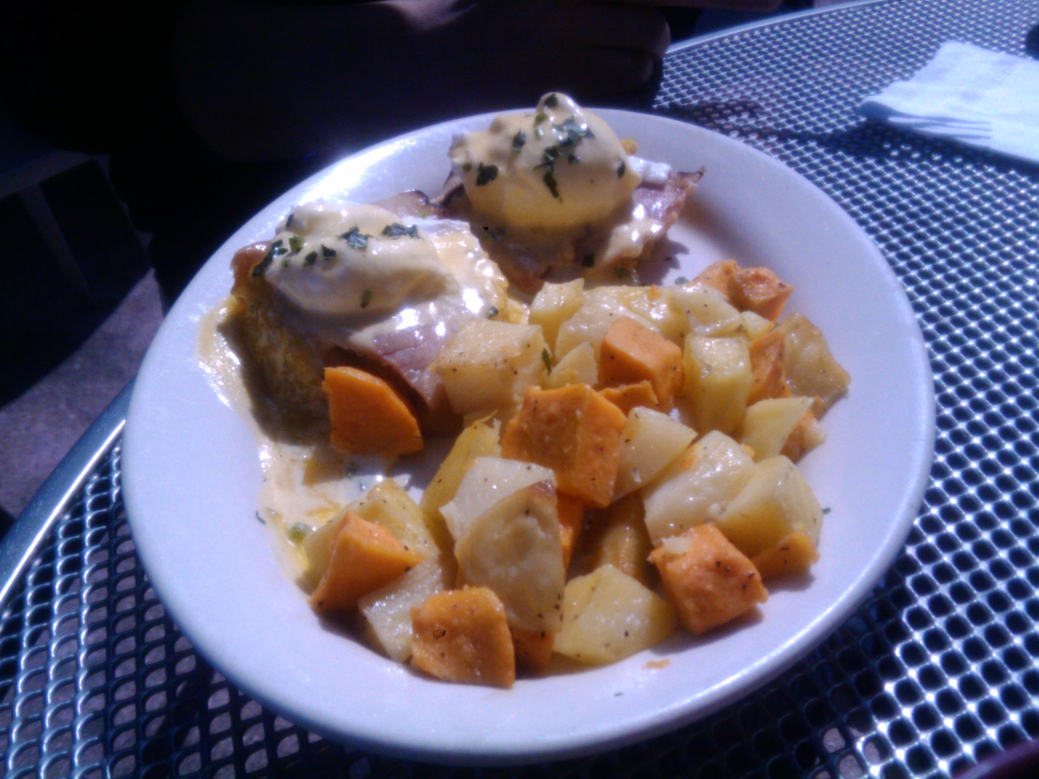 Stu’s entree was the first to arrive, with the onion, but also with the sausage. The food runner or whoever it was that brought the entree was great though.  He apologized and took it back to the kitchen to get fixed. While we were waiting for round 2 on Stu’s meal, Meg’s entree arrived. A few minutes later Stu’s panini made a return sans meat. But I was still waiting on the my eggs Bendict. So I asked the guy bringing out the food; he seemed confused and went to check with the kitchen. He came back to the table and said the kitchen had never gotten the ticket, but it was making the dish now and it would be out soon. A few minutes later, a nice woman, who seemed to be the manager, came over and apologized and assured us the food would be there soon. After another few minutes, our elusive waiter stopped by to say the same, but started to run off as we were mid-sentence asking for a coffee and booze refill. Finally, my eggs made it to the table. Again, this wasn’t any huge disaster (thought I’m not sure how it seemed normal that I was only doing part of the prix fixe), but was just one of many things–especially the server’s attitude–that soured the brunch.