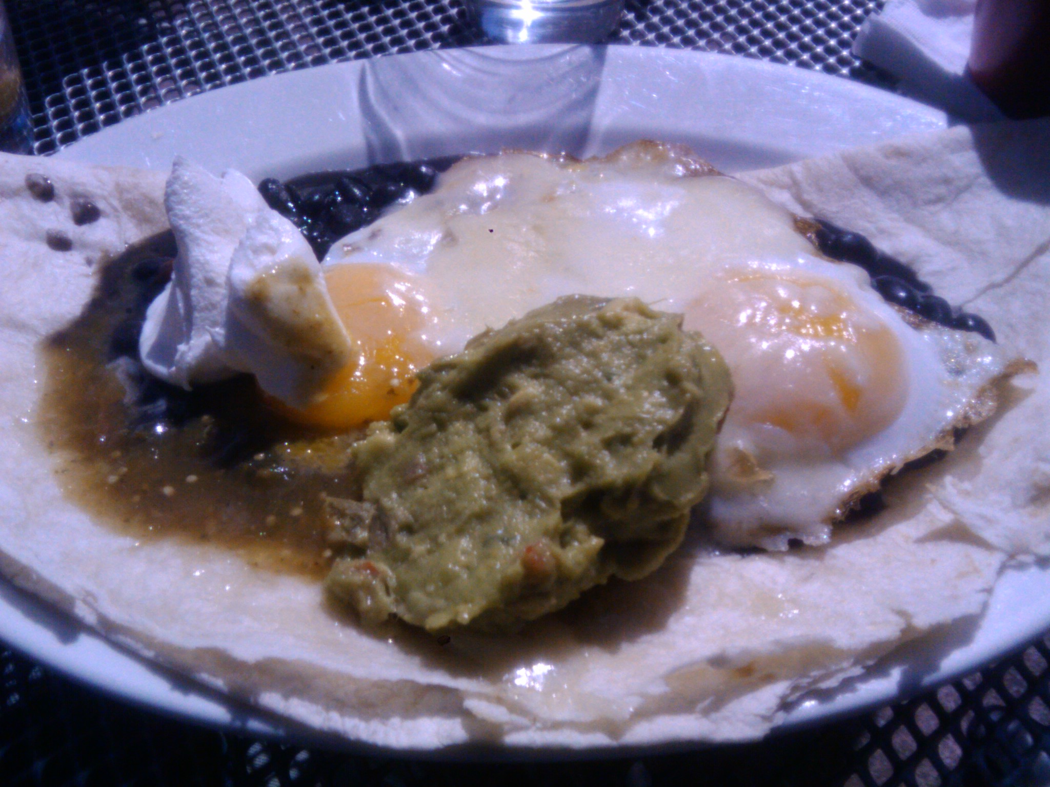 The huevos rancheros started with a tortilla and with a layer of black beans, topped with two perfectly-fried eggs, some sour cream, and guacamole.  With a generous helping of the Tabasco sauce (I’m a big fan of spice, in case you haven’t noticed), I was very content.  I just love  the combination of black beans and eggs for breakfast.  And the eggs were done right, with nice runny yolks, but a good crisp on the bottom and edges.  (The color in the photo is a little  off, the guac was beautiful and bright in person–my cellphone camera sometimes just decides to blue out pictures.)