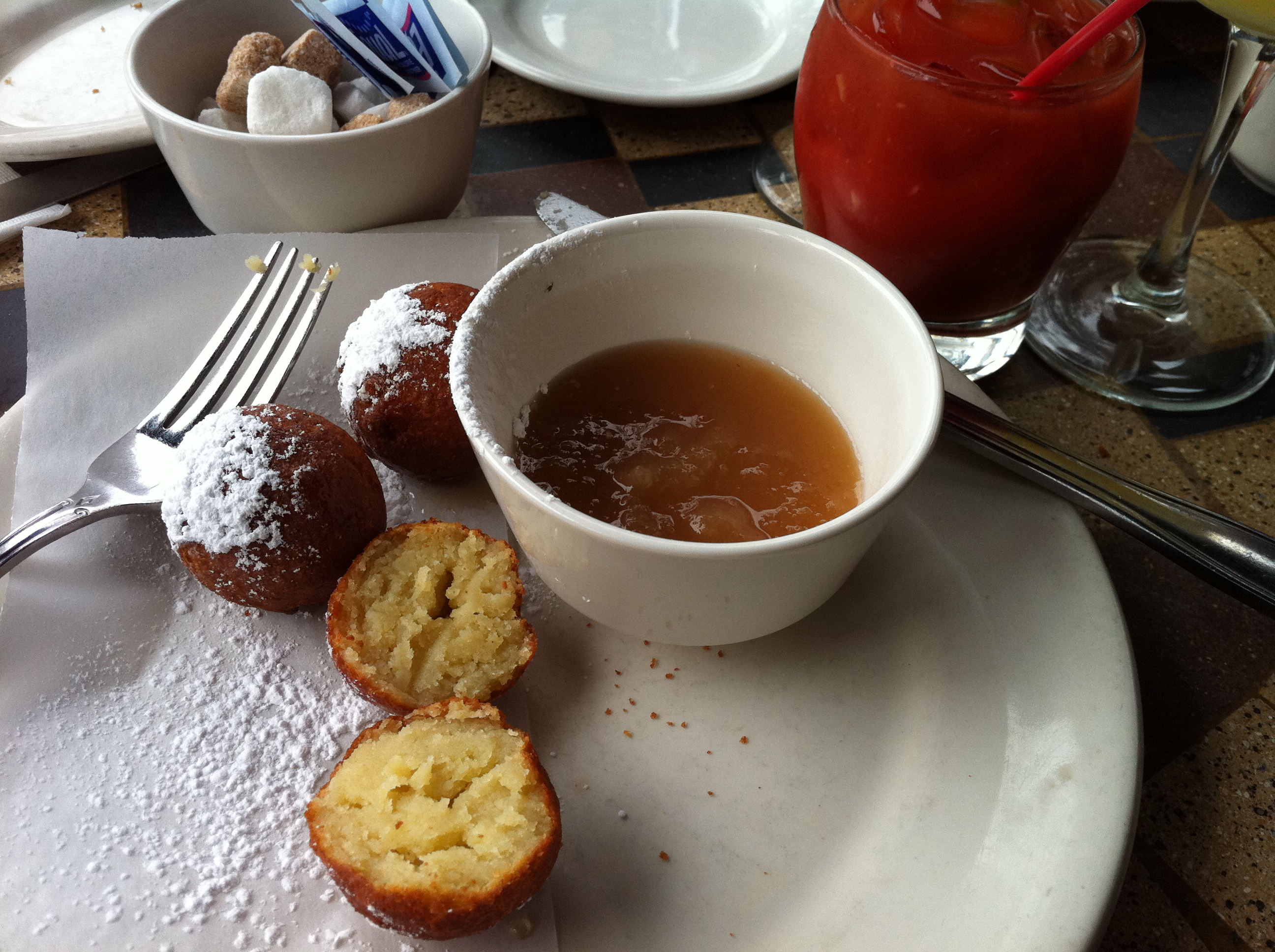 The confusion for our server seemed present from her first appearance: she poked her head out the back door, looked around and pondered, seemingly to herself, whether we were her party of five. She slipped back inside and came back in a few minutes with water and only 4 sets of cutlery for the 5 of us. But she was positive and upbeat and we all enjoyed exchanging a few stupid jokes as we ordered.  The food came out in spurts, and there was a need to switch-up an order of waffles because the kitchen had run out of batter.  After the first plate or two came out Matt, in visible pain, decided that the night before had gotten the better of him, and that it was best that he head home for a nap.  There seemed to be a lot of confusion about what food would be ready when.  At one point, refilling our coffee, the waitress looked  particularly stressed and we inquired what was going on.  A little prodding finally invoked a report of a fight in the kitchen (which she had just broken up), but she assured us that everything was back on track now and the rest of the food would be on its way.  We then, along with a number of apologies, received the rest of the orders  as they were ready.
