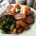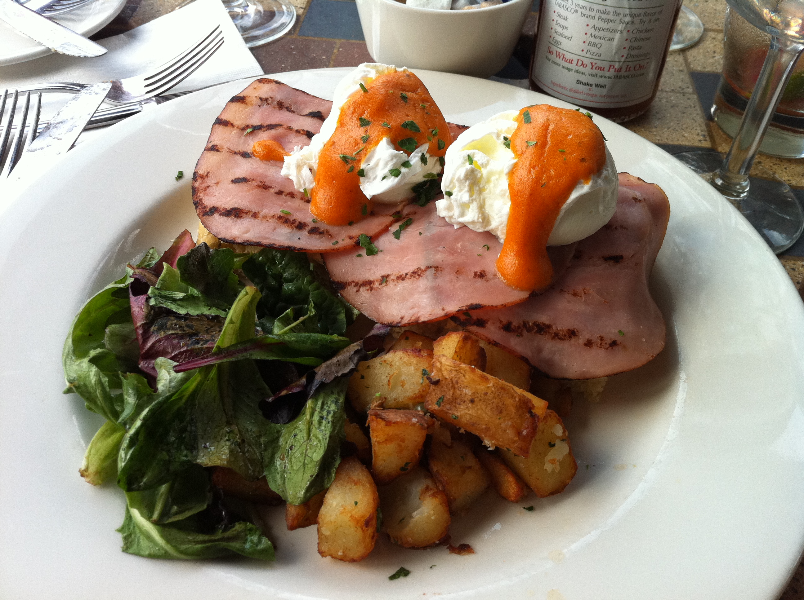 The eggs Benedict was good. The picture makes it look unappetizing, but it really looked amazing. The white on the outside of the eggs had a perfect cloud like appearance. My one criticism would be that there was too much ham. More precisely, the ham formed a meaty shield for the bread so that when I cut into the poached egg the wonderful yolk ran over the ham on to the plate and didn’t get much of a chance to sink into the bread. Also, foccacia bread, because of the the nature of its outside, simply isn’t that absorbent.