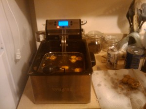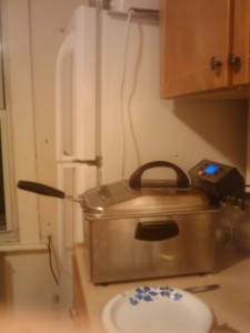 But with a longer train ride has come a large kitchen. With plenty of counter and storage space it was time to fry! I actually first broke in the deepfyer a few months ago for a poker game. So this last time wasn’t the virgin run, but it was the first time I thought about taking some pictures and writing about it.