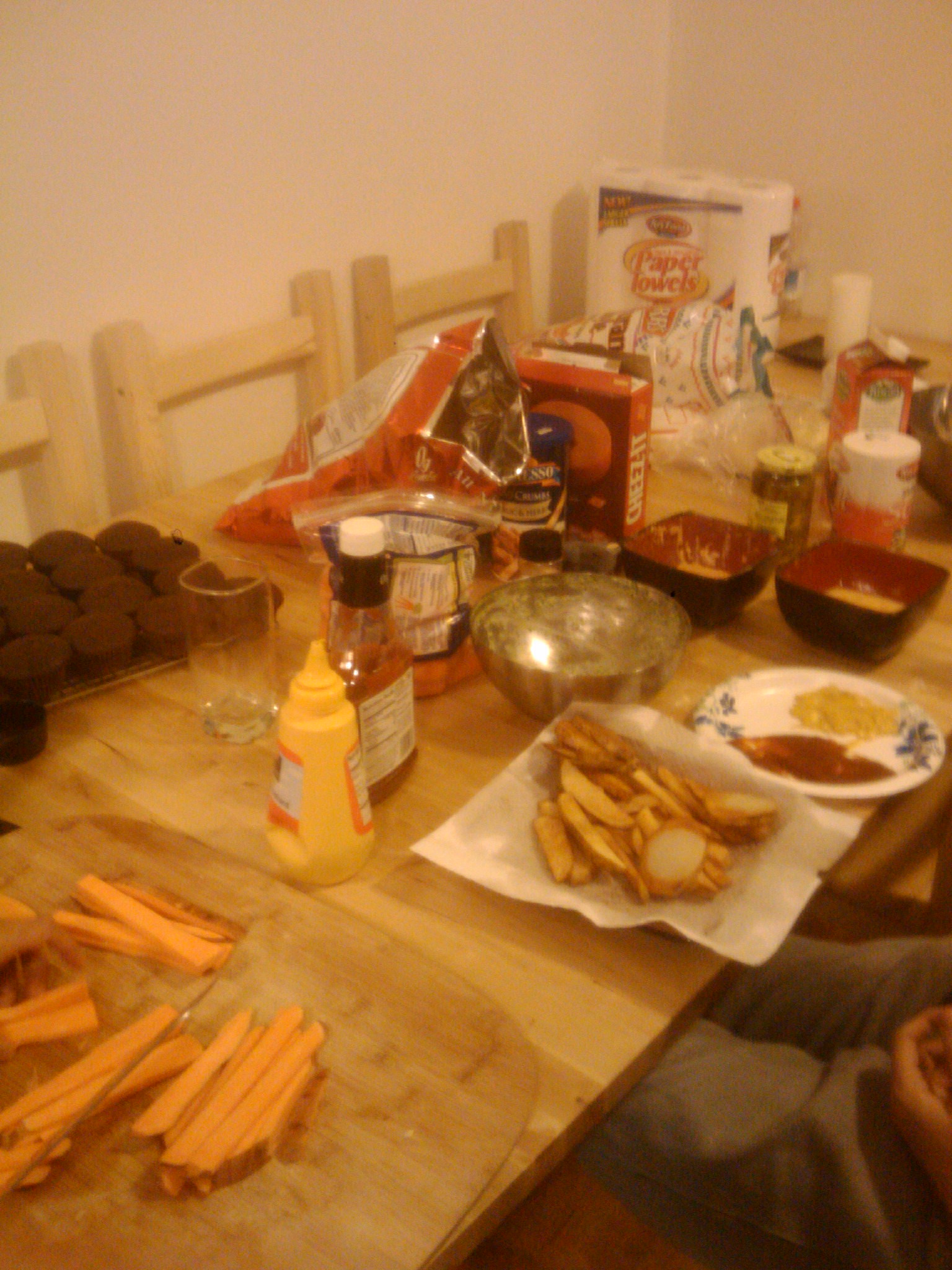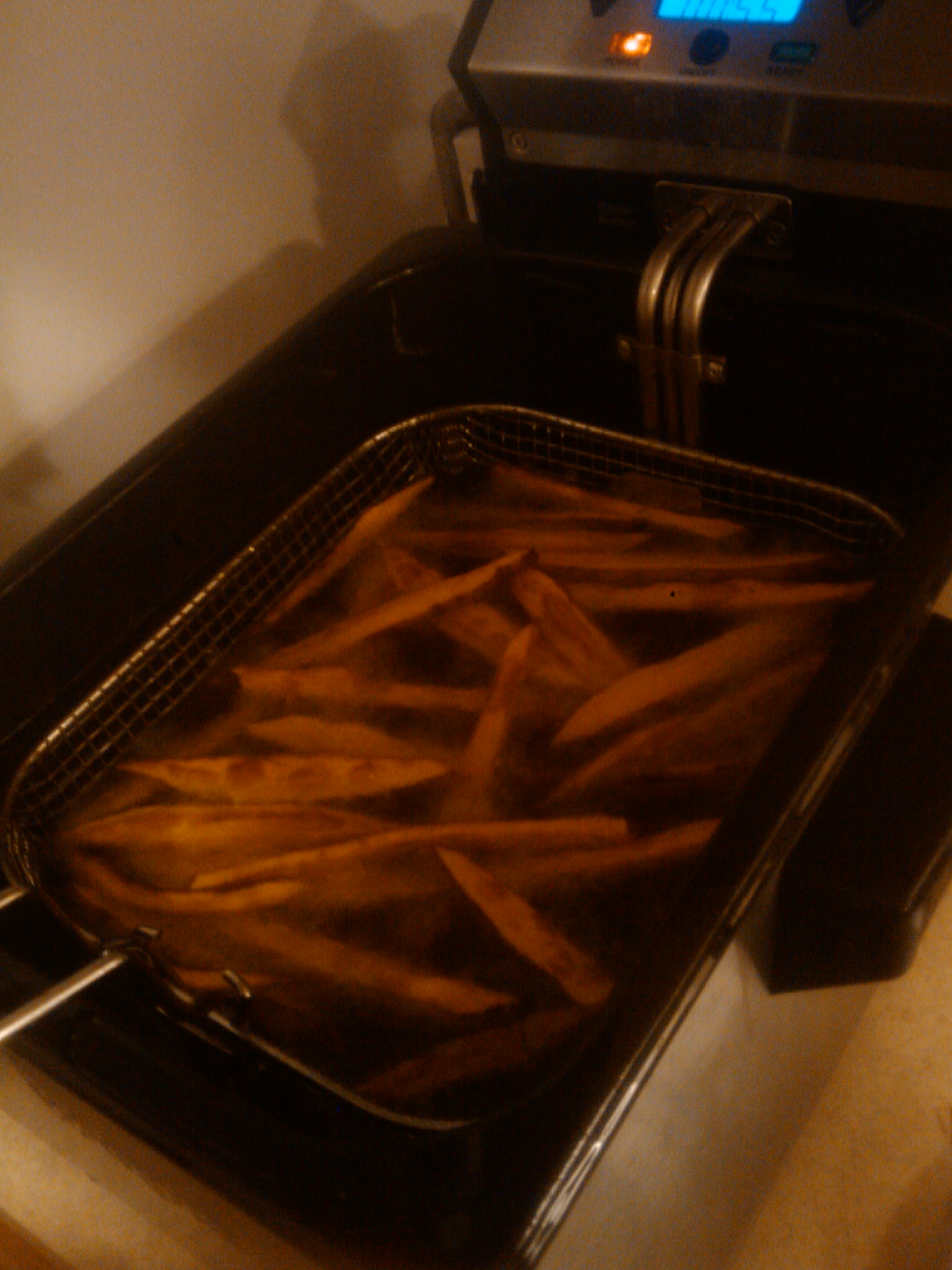 Next up was the fries, both regular and sweet potato. The regular fries turned out well, but not as crispy as I had hoped. I think that I might have under-timed the first fry of the double frying process.  (In order to get fries nice and crispy on the outside and soft on the inside you first fry at 325, take them out for a few minutes, and then fry them at 375.) Still, even though they were less crispy then I would have personally liked, they were well-loved. The sweet potato fries presented a whole other problem in the second step of the double-fry process. The sweet potatoes’ high sugar conten started to caramelize and almost burn at the high temp on the second fry. The result was a little ugly, but was really tasty—a little sugar, a little caramel, and some starch.