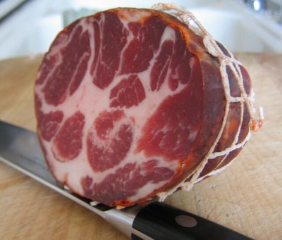 On a side note, please do yourself a favor and go buy a half pound of capocollo. This delicious salumi is dry cured from the meat on the neck and shoulder cuts of the pig. It’s like a cross between canadian bacon, real bacon (take that Canada!), and prosciutto. It’s not usually smoked to the best of my knowledge, but there is sometimes a spicy or savory coating on the outside of the meat. The marbling, which is amply demonstrated below, is incredible and gives it a deep, rich flavor. Get your butcher to slice it thin, and eat a few slices while you walk around the grocery store and decide what you want to do with this manna from heaven.
