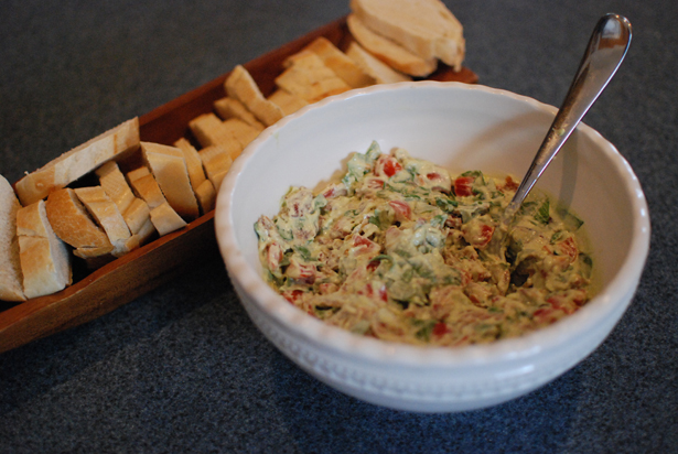 For the base of the dip, skin and pit two ripe avocados and drop them into a blender along with 1/3 cup of sour cream and 1/3 cup of mayo and the juice of half a lemon. Blend that until smooth and add to your serving dish. Add to that a carton of cherry tomatoes which you quartered, about 1 Tbsp of minced shallot, and half a pound of torn arugula leaves. I love arugula; it’s so peppery and unique for a green leafy vegetable. And this is a great recipe for it because you need something that will have a flavor capable of standing up to the creamy avocado/mayo/sourcream mixture.