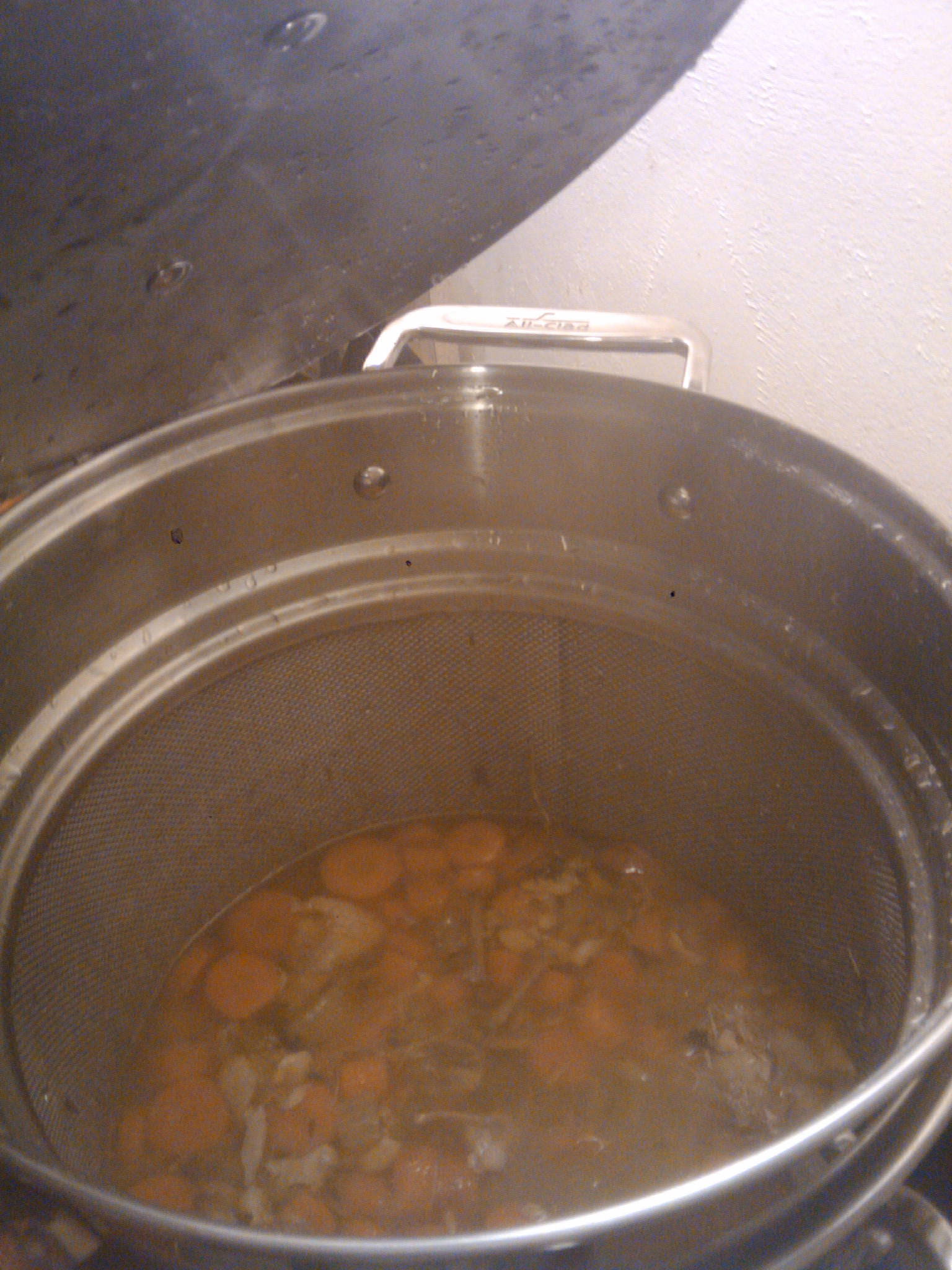 When you are ready to start, there isn’t a “right way” to make chicken stock.  Basically, you take whatever is left of the chicken and  put it in a pot with a bunch of water, some chopped celery (and/or celeriac), chopped carrots, and a few herbs.  Then you let it all cook for a 7-9 hours, run it through a fine mesh strainer to get a nice pure liquid that is free of all of the small chicken bones.  But for those of you looking for an actual recipe, below is an ingredient list courtesy of  Alton Brown: