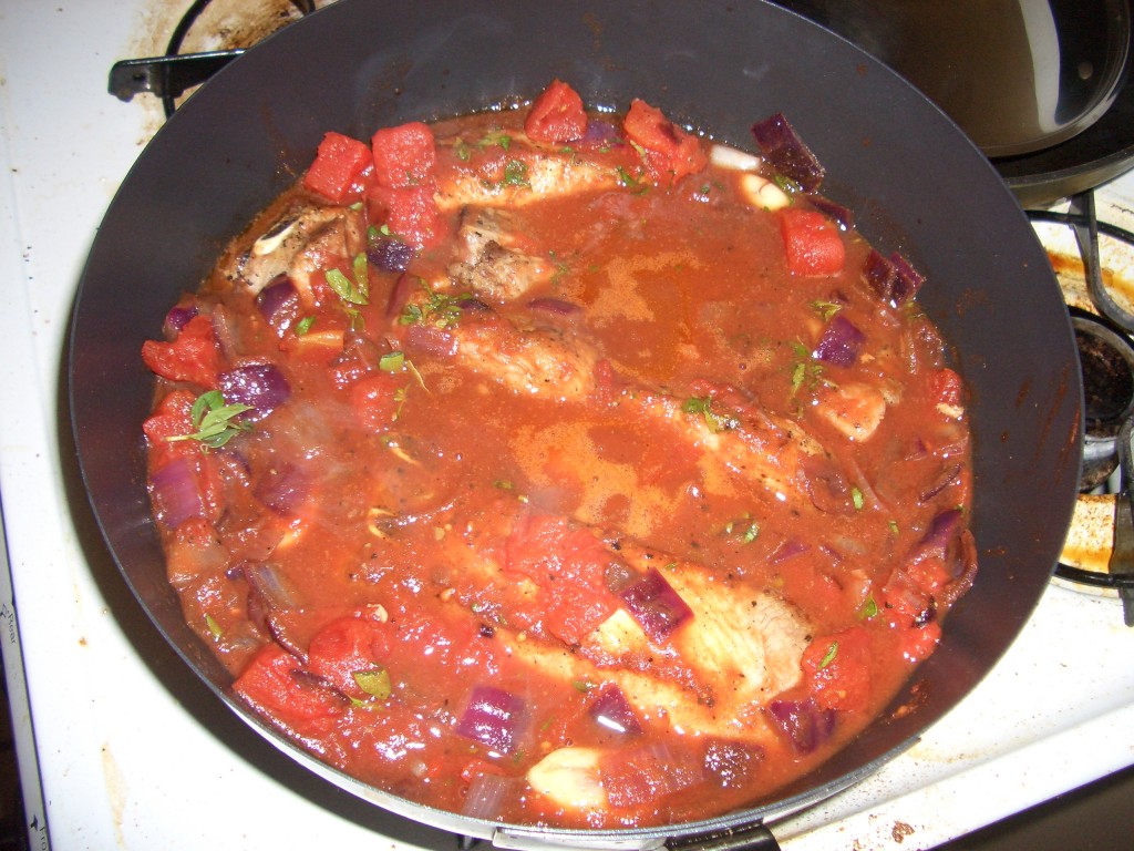 This last weekend I made the same meal with chicken and a few eggs on the side for an at home brunch. Â The chicken recipe tracks the pork with a reduced cook time (for sliced chicken it was about 20 minutes of stove top in sauce cook time).