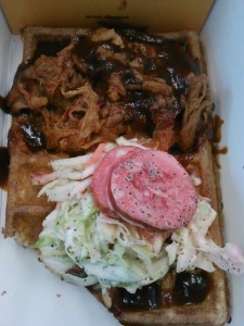 Last year, I discovered the wonder that is the Wafels & Dinges food truck.  Since my first visit, I’ve made several returns and sampled a range sweet delights.  However, I always kept my eye on the BBQ pork waffle.  Until last Friday, my timing never seemed to able to match-up with lunch.
