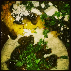 The cook book tells me the sauce can keep in the fridge for a week and on both cookings it seemed better the next day. Â (I’m eating Sunday brunch leftovers for lunch as I type.) Â I think I might next need to make the sauce a couple days in advance. Â Then I’ll be just 30 minutes away from my next taco night!